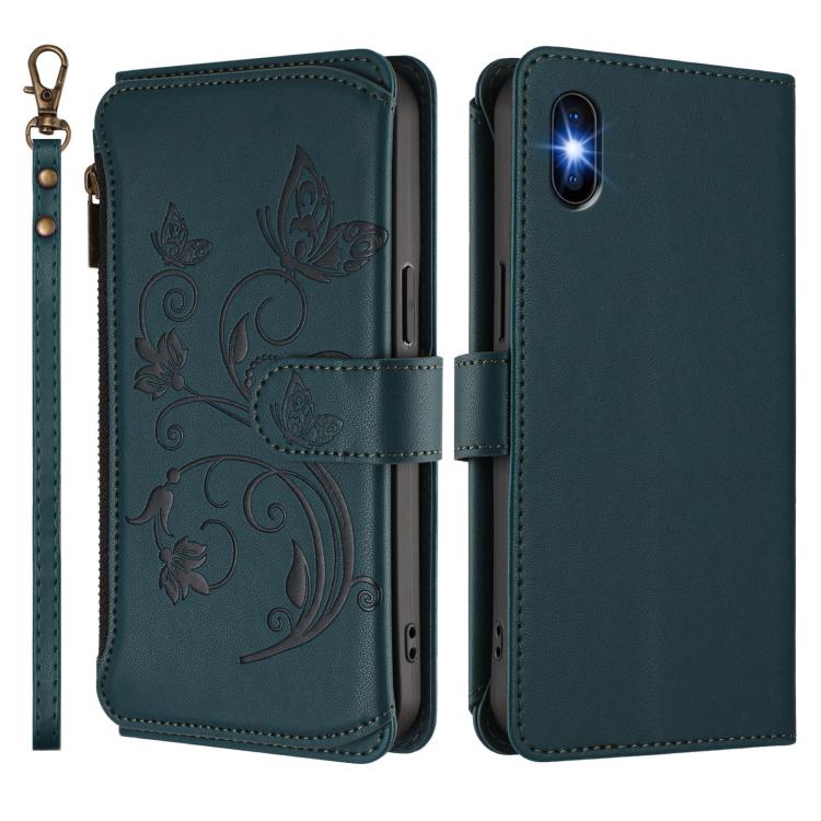 Funda de cuero con cremallera para iPhone XS Max, diseño de mariposas, flores y amor, con múltiples tarjetas (verde oscuro)