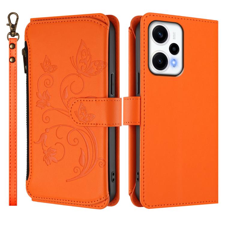 Funda de cuero con cremallera para Redmi Note 12 Turbo / Xiaomi Poco F5, diseño de mariposas, flores y mariposas (naranja)
