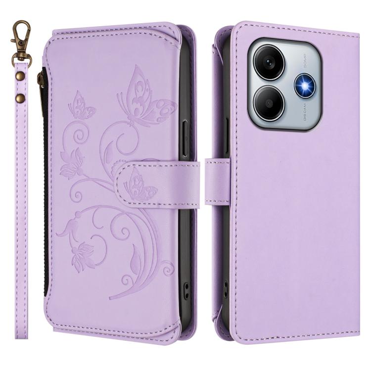 Funda de cuero con cremallera para Redmi Note 14 4G (163,25 mm), diseño de mariposas y flores, con múltiples tarjetas (morado claro)