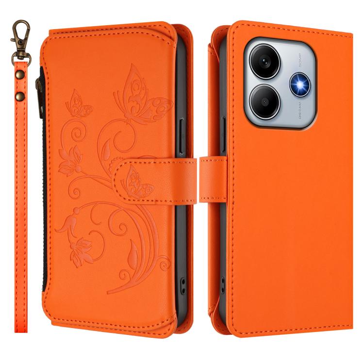 Funda de cuero con cremallera para Redmi Note 14 4G, 164,84 mm, diseño de mariposas y flores, con múltiples tarjetas (naranja)
