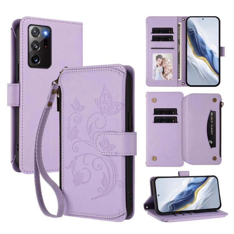 Funda de cuero con cremallera para Samsung Galaxy Note20 Ultra, diseño de mariposas, flores y amor, con múltiples tarjetas (morado claro)