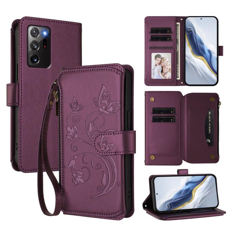 Funda de cuero con cremallera para Samsung Galaxy Note20 Ultra, diseño de mariposas, flores y amor, con múltiples tarjetas (morado oscuro)