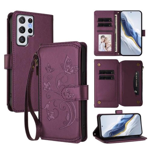 Funda de cuero con cremallera para Samsung Galaxy S22 Ultra 5G, diseño de mariposas, flores y amor, con múltiples tarjetas (morado oscuro)
