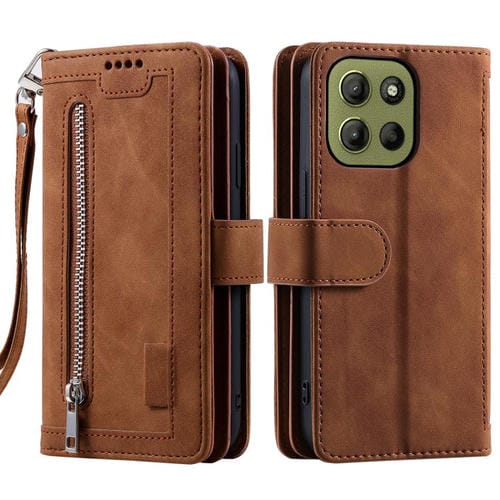Funda de Cuero con Cremallera y Cordón para Motorola Moto G15 Nine Card (Marrón)