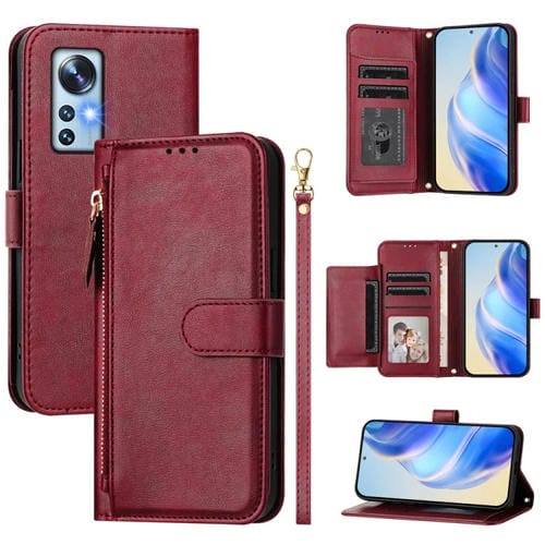 Funda de Cuero con Cremallera y Ranuras para Varias Tarjetas para Xiaomi 12/12X/12S (Rojo Oscuro)