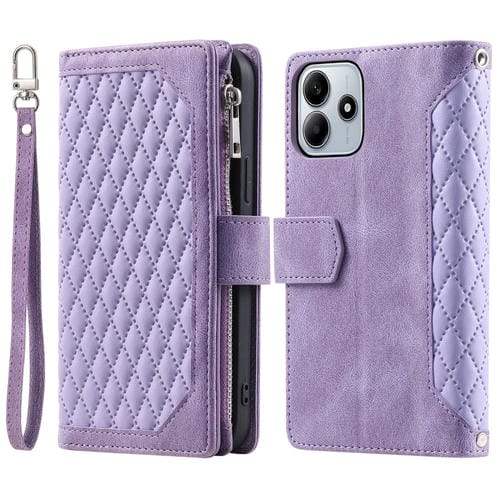 Funda de Cuero con Cremallera y Textura de Cuadrícula para Xiaomi Redmi Note 14 5G con Cordón (Morado)