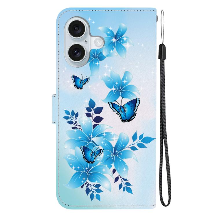 Funda de Cuero para iPhone 16 con Dibujo de Colores y Textura de Cristal (Mariposas Azules)