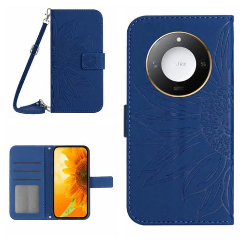 Funda de Cuero con Diseño de Flores y Sol con Cordón para Honor X9C (Azul Oscuro)