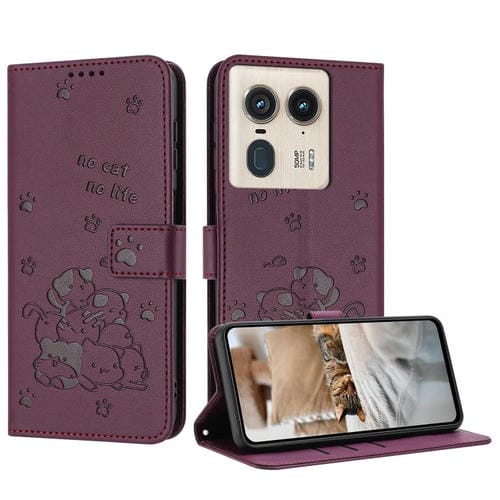 Funda de Cuero Motorola Edge 50 Ultra con Diseño de Gatito en Relieve y Cordón (Rojo Vino)