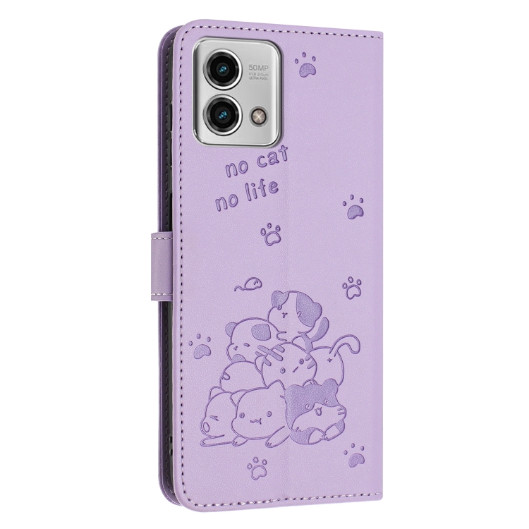 Funda de Cuero para Motorola Moto G Stylus 2023 4G con Diseño de Gatito en Relieve y Cordón (Morado)
