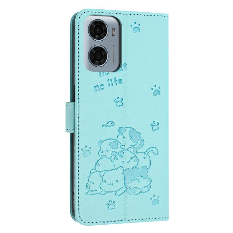Funda de Cuero Motorola Moto G05 Diseño Gatito En Relieve con Cordón (Verde Menta)