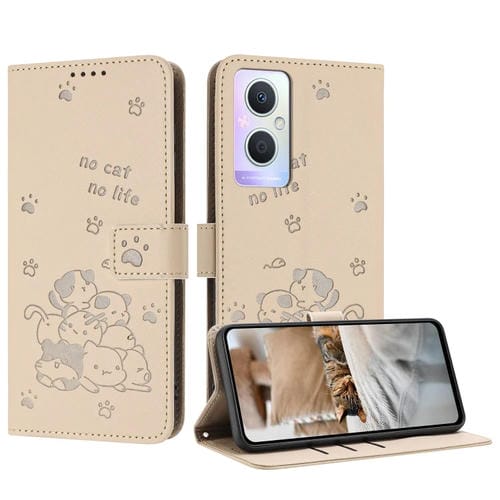 Funda de Piel con Diseño de Gatito En Relieve para Oppo Reno7 Z Global con Cordón (Beige)