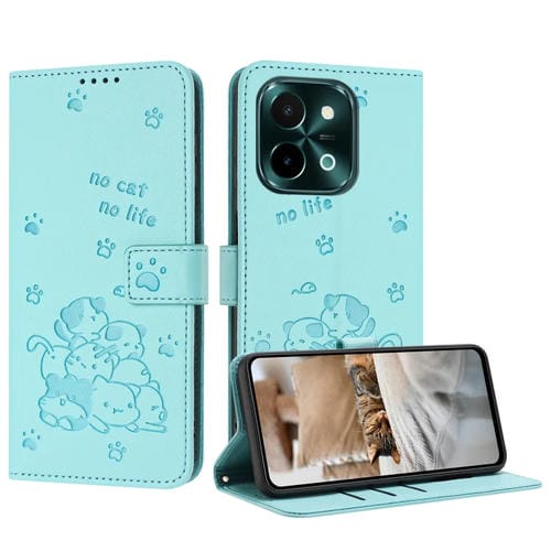 Funda de Piel con Diseño de Gatito En Relieve y Cordón para Vivo Y28 4G / Iqoo Z9X 5G (Verde Menta)