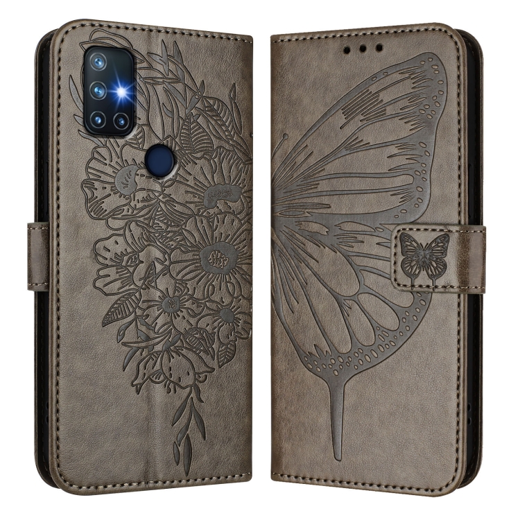 Funda de Cuero para OnePlus Nord N10 5G con Diseño de Mariposa en Relieve (Gris)