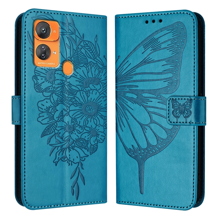 Funda de Cuero para Oukitel C33 con Diseño de Mariposa en Relieve (Azul)