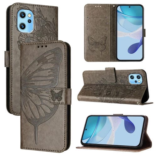 Funda de Cuero para Umidigi Power 7 Max con Diseño de Mariposa en Relieve (Gris)