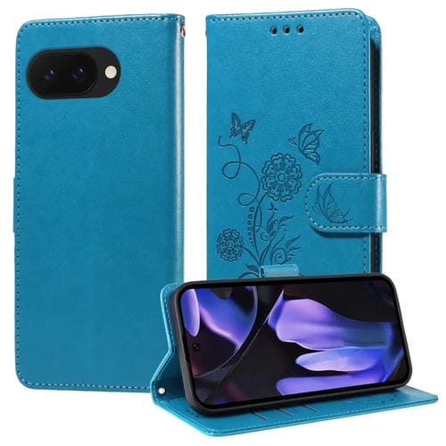Funda de Cuero para Google Pixel 9A con Diseño de Mariposas y Flores en Relieve (Azul)