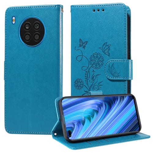 Funda de Cuero con Diseño de Mariposas y Flores en Relieve para Honor 50 Lite/X20/Huawei Nova 8I (Azul)