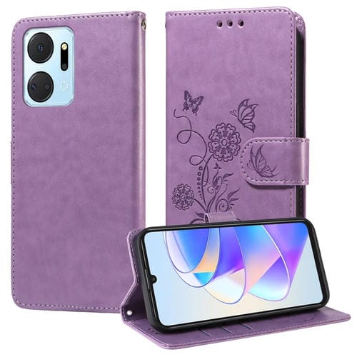 Funda de Cuero para Honor X7A 4G Play 7T con Diseño de Mariposas y Flores en Relieve (Morado)