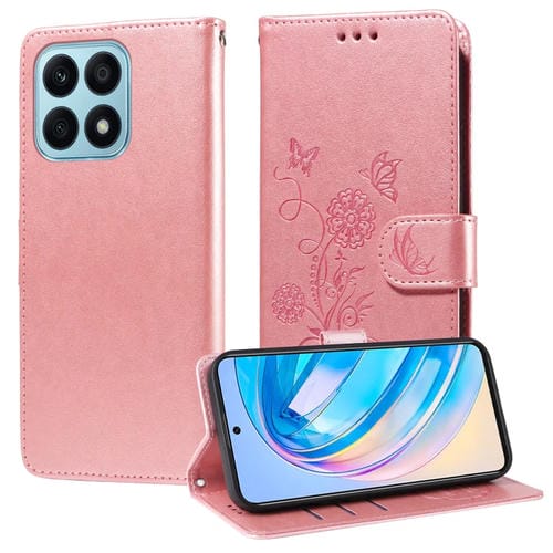 Funda de Cuero para Honor X8A 4G con Diseño de Mariposas y Flores en Relieve (Oro Rosa)