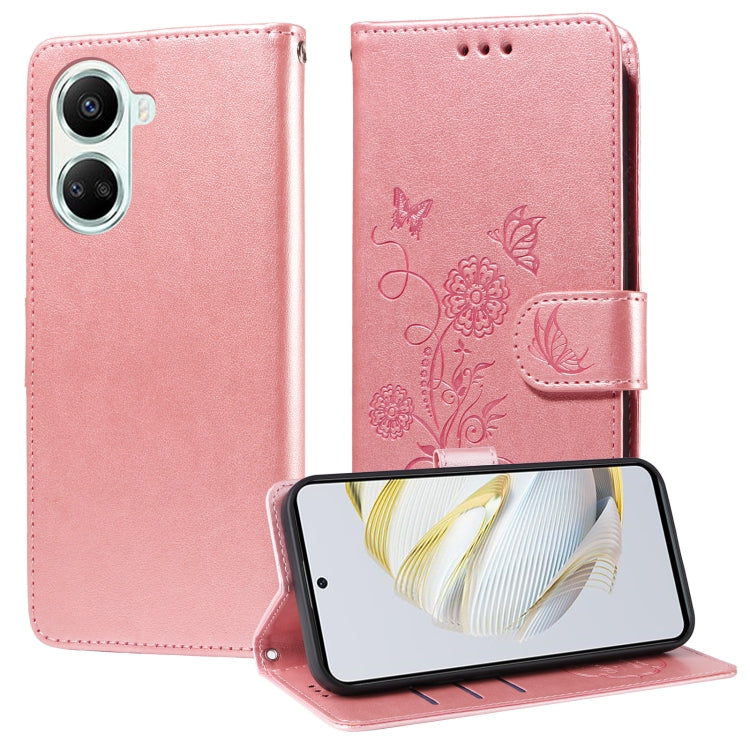 Funda de Cuero Huawei Nova 10 Se con Diseño de Mariposas y Flores en Relieve (Oro Rosa)