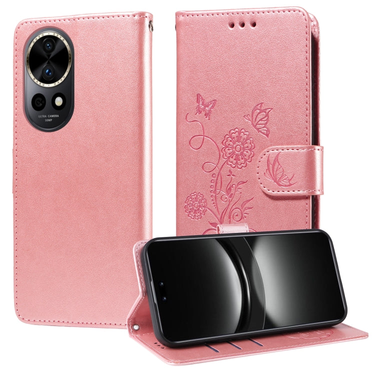 Funda de Cuero Huawei Nova 12 Pro y Nova 12 Ultra con Diseño de Mariposas y Flores en Relieve (Oro Rosa)