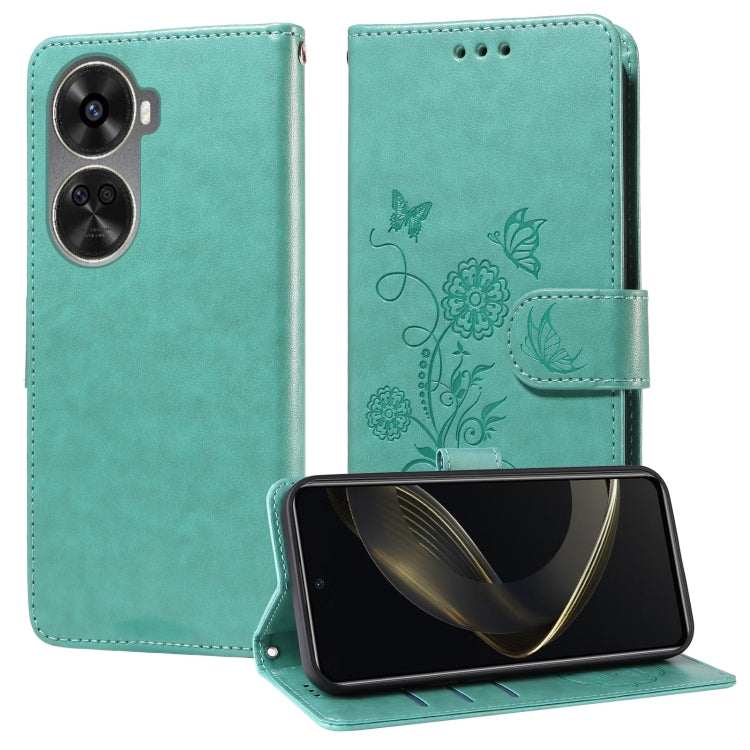 Funda de Cuero Huawei Nova 12 Se 4G con Diseño de Mariposas y Flores en Relieve (Verde)
