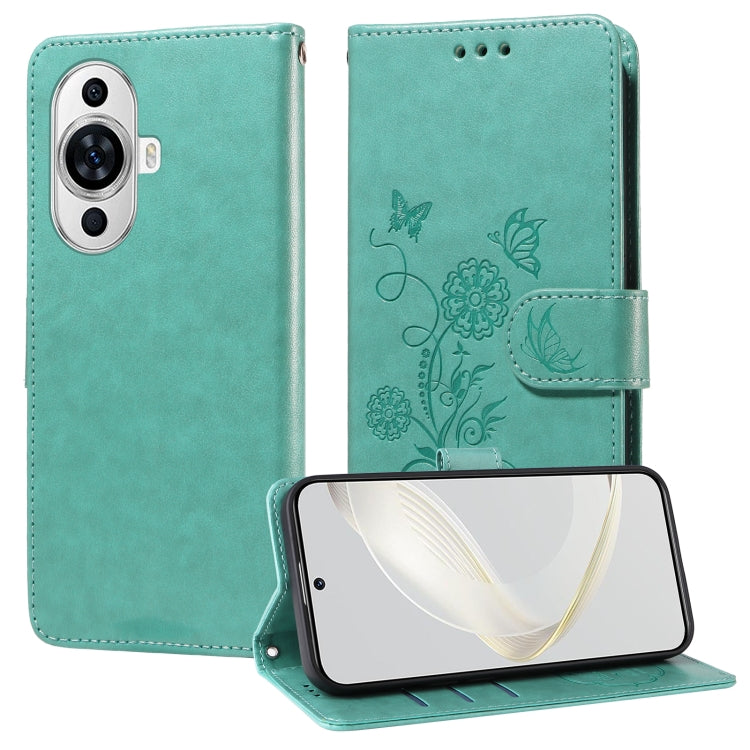 Funda de Cuero Huawei Nova 12S 4G con Diseño de Mariposas y Flores en Relieve (Verde)