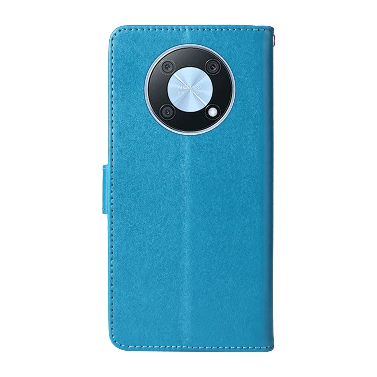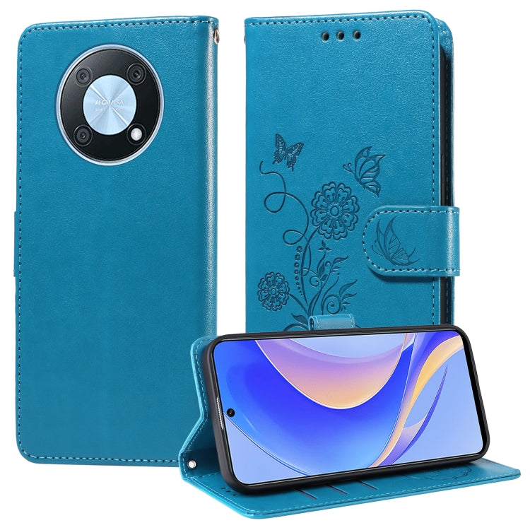 Funda de Cuero Huawei Nova Y90 con Diseño de Mariposas y Flores en Relieve (Azul)