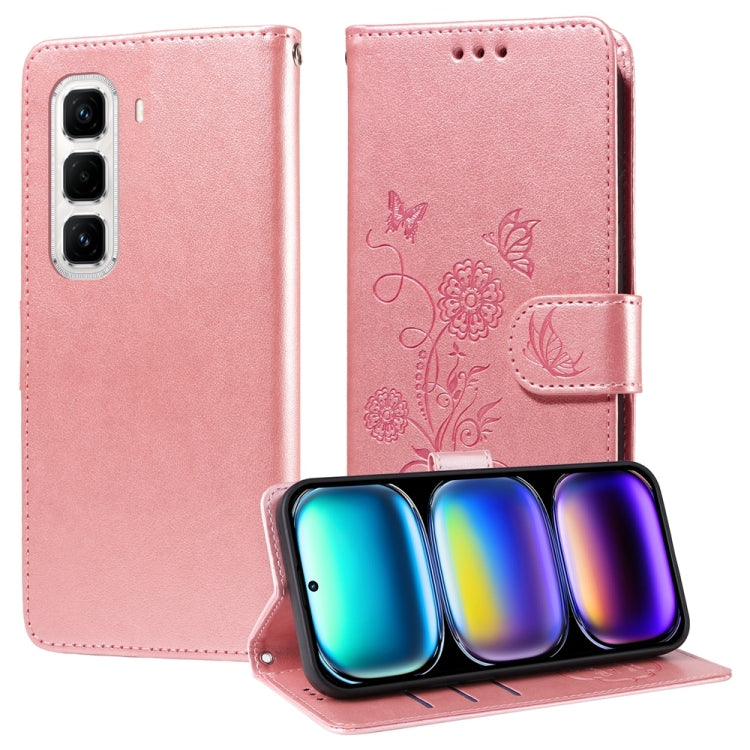 Funda de Cuero para Infinix Hot 50 Pro+ 4G con Diseño de Mariposas y Flores en Relieve (Oro Rosa)