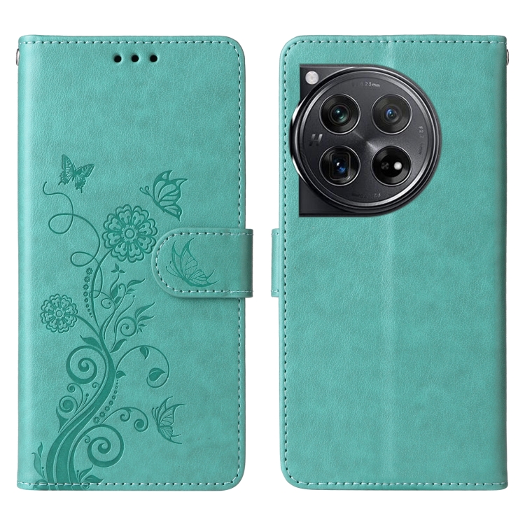 Funda de Cuero para OnePlus 12 con Diseño de Mariposas y Flores en Relieve (Verde)