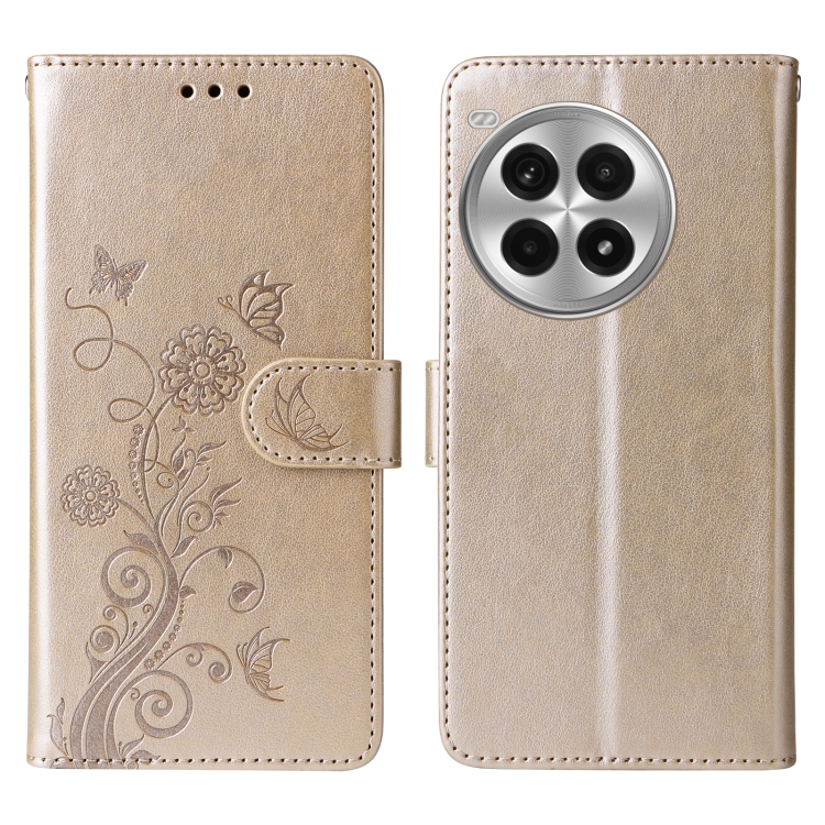 Funda de Cuero OnePlus Ace 3 Pro 5G con Diseño de Mariposas y Flores en Relieve (Dorada)