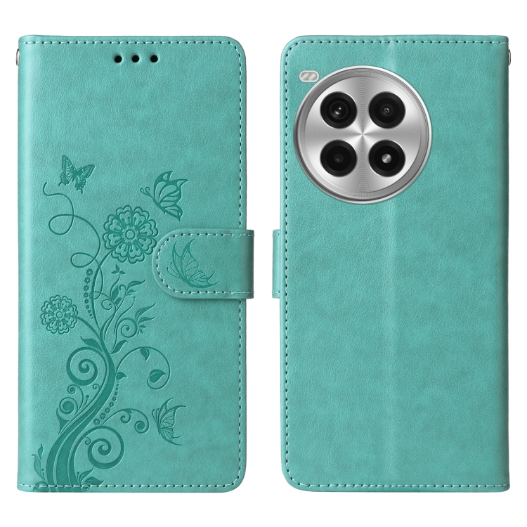 Funda de Cuero OnePlus Ace 3 Pro 5G con Diseño de Mariposas y Flores en Relieve (Verde)