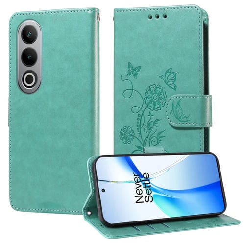 Funda de Cuero para OnePlus Ace 3V con Diseño de Mariposas y Flores en Relieve (Verde)