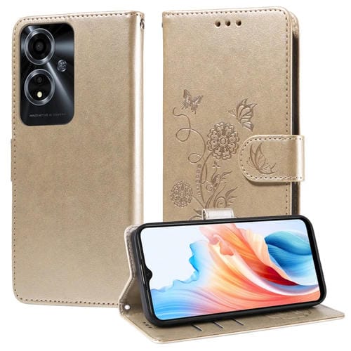 Funda de Cuero con Diseño de Mariposas y Flores En Relieve para Oppo A59 5G (Dorada)