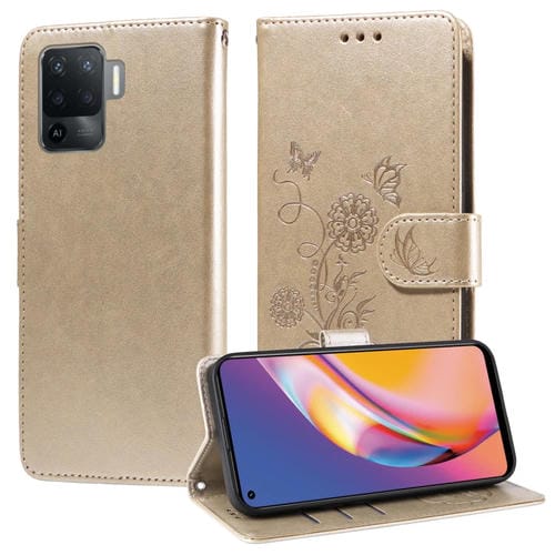 Funda de Cuero con Diseño de Mariposas y Flores En Relieve para Oppo A94 4G/5G/A95 5G/F19 Pro (Dorada)