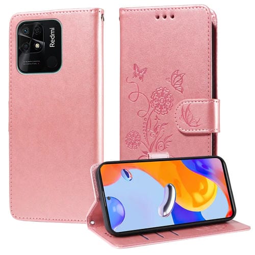 Funda de Cuero con Diseño de Mariposas y Flores En Relieve para Redmi 10C/10 India/10 Power (Oro Rosa)