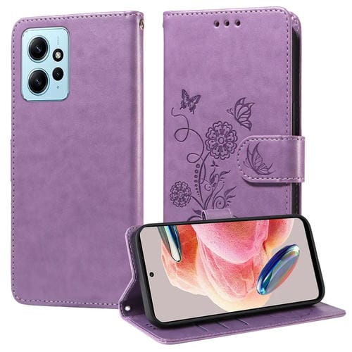 Funda de Cuero con Diseño de Mariposas y Flores En Relieve para Redmi Note 12 4G (Morado)