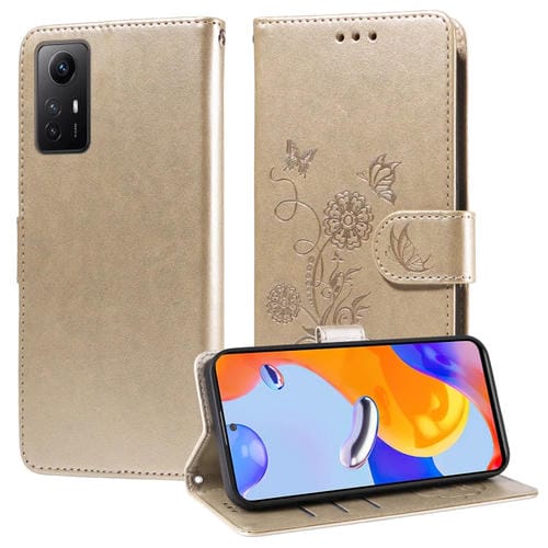 Funda de Cuero con Diseño de Mariposas y Flores En Relieve para Redmi Note 12S 4G (Dorada)