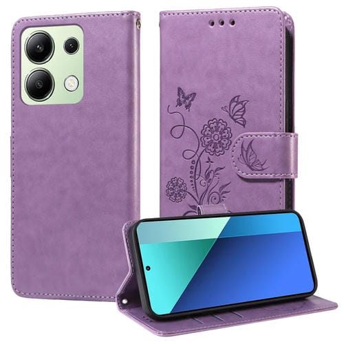 Funda de Cuero con Diseño de Mariposas y Flores En Relieve para Redmi Note 13 4G (Morado)