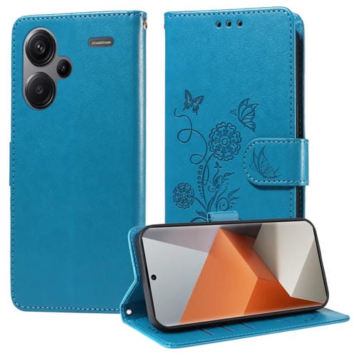 Funda de Cuero con Diseño de Mariposas y Flores En Relieve para Redmi Note 13 Pro+ 5G (Azul)