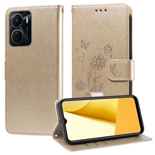 Funda de Cuero con Diseño de Mariposas y Flores En Relieve para Vivo Y16 4G / Y02S / Y56 5G (Dorada)