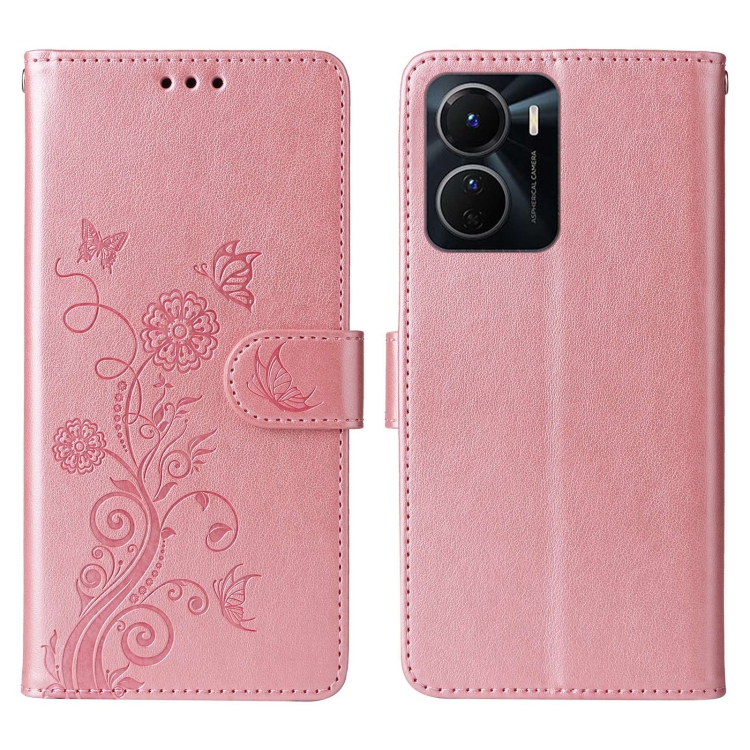 Funda de Cuero con Diseño de Mariposas y Flores En Relieve para Vivo Y16 4G / Y02S / Y56 5G (Oro Rosa)