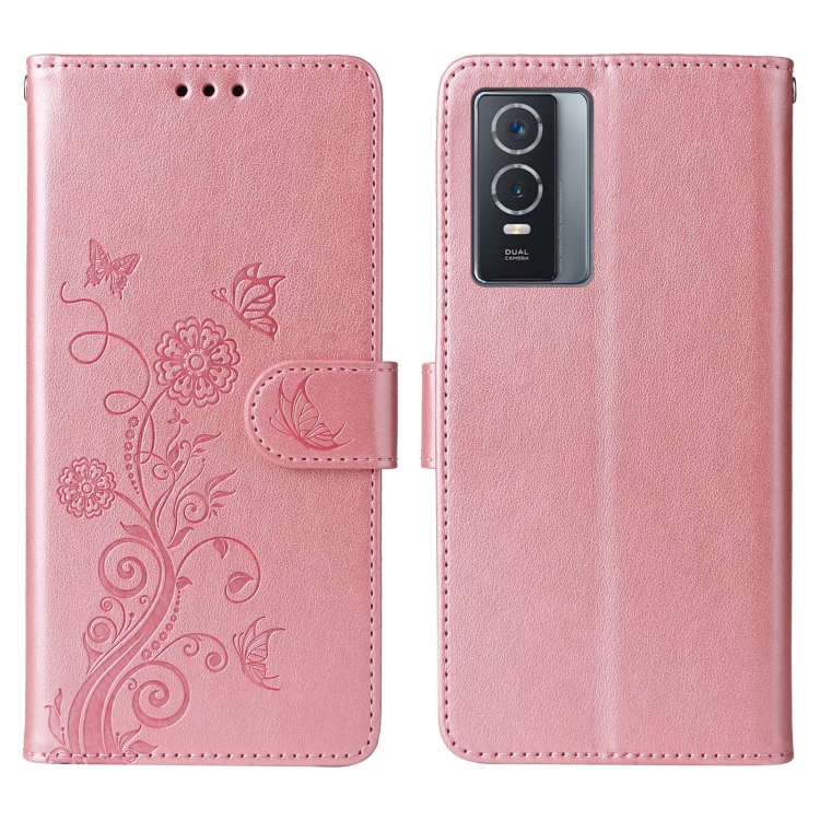 Funda de Cuero con Diseño de Mariposas y Flores En Relieve para Vivo Y76 5G/Y76S (Oro Rosa)