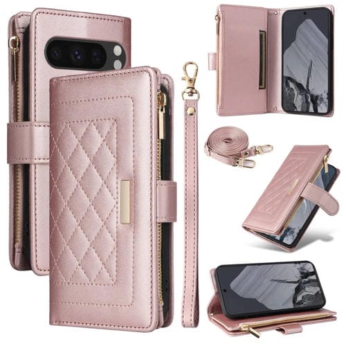 Funda de Cuero Google Pixel 8 Pro con Diseño de Rombos y Billetera Cruzada con Cremallera (Oro Rosa)
