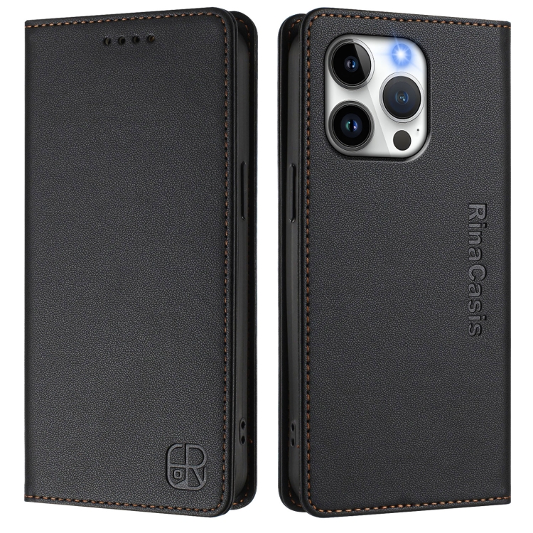 Funda de Cuero Rc01 para iPhone 14 Pro Max con Doble Pliegue y Succión Magnética (Negra)
