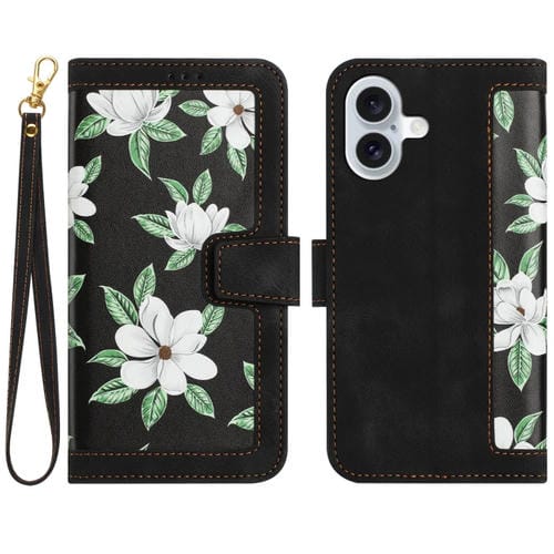 Funda de Cuero para iPhone 16 con Estampado Floral y Cordón (Negro)