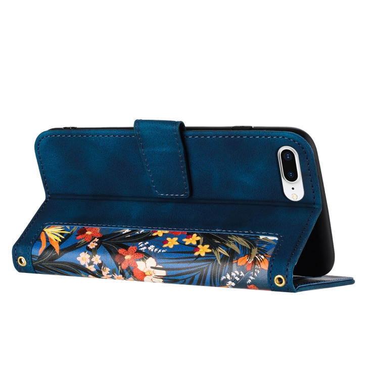 Funda de Cuero para iPhone 8 Plus/7 Plus con Estampado Floral y Cordón (Azul Oscuro)