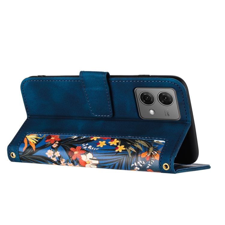 Funda de Cuero con Estampado Floral para Motorola Moto G84 con Cordón (Azul Oscuro)