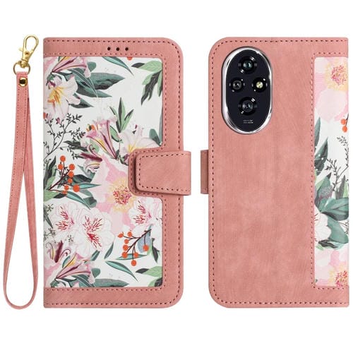 Funda de Cuero Honor 200 Pro con Estampado Floral y Cordón (Rosa)